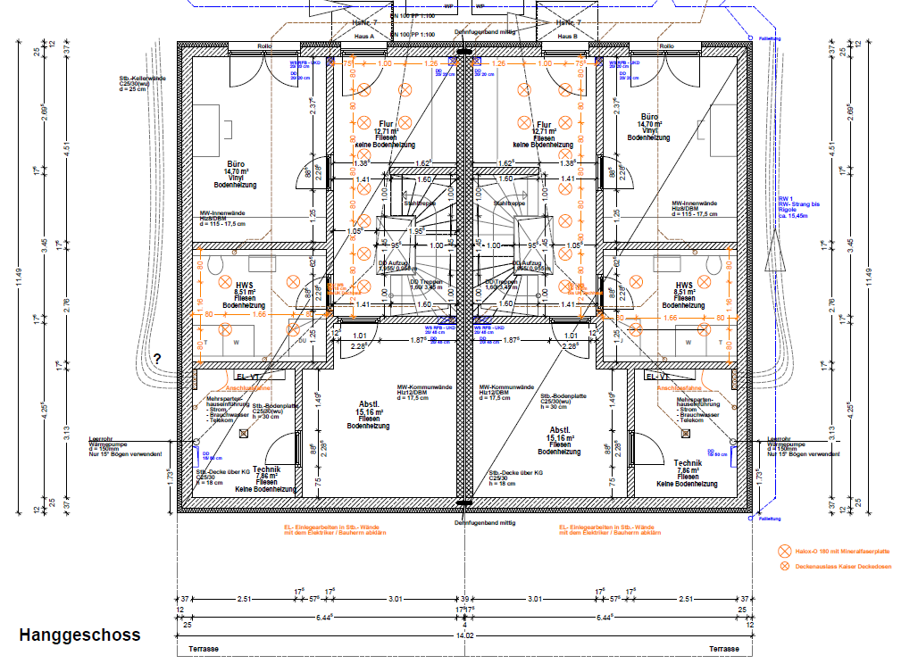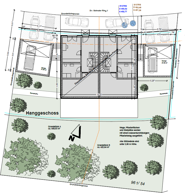 Durch den geräumigen Eingangsbereich gelangen wir direkt in das Hanggeschoss. Dort befindet sich ein Büro, ein Hauswirtschaftsraum/ Badezimmer, der Technikraum sowie ein großer Hobbyraum/ Abstellraum.